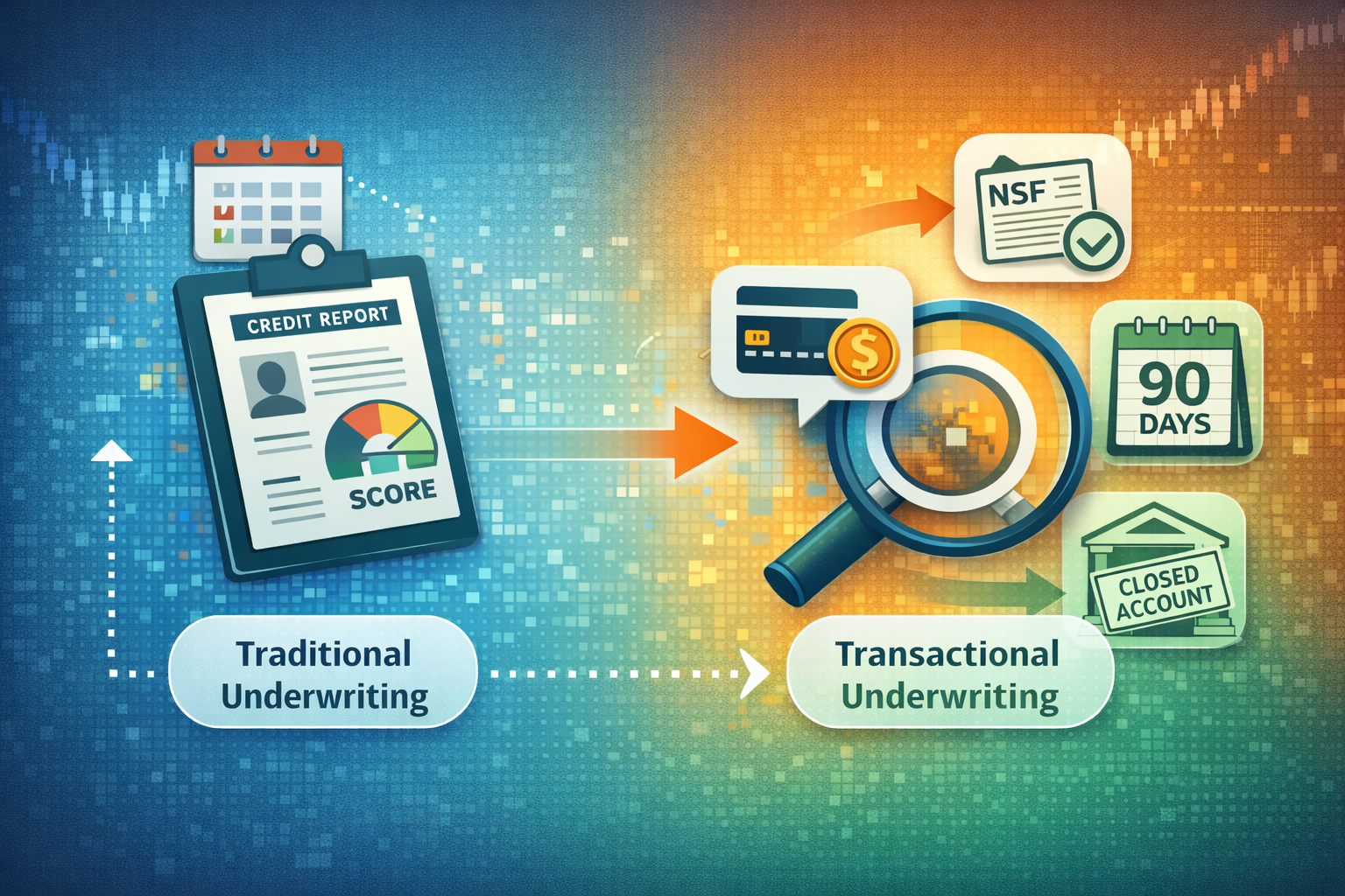 Traditional underwriting relies heavily on credit reports and scores. Those tools focus on what happened months or even years ago. Transactional underwriting shifts the focus to what is happening right now—especially around how money is actually moving.